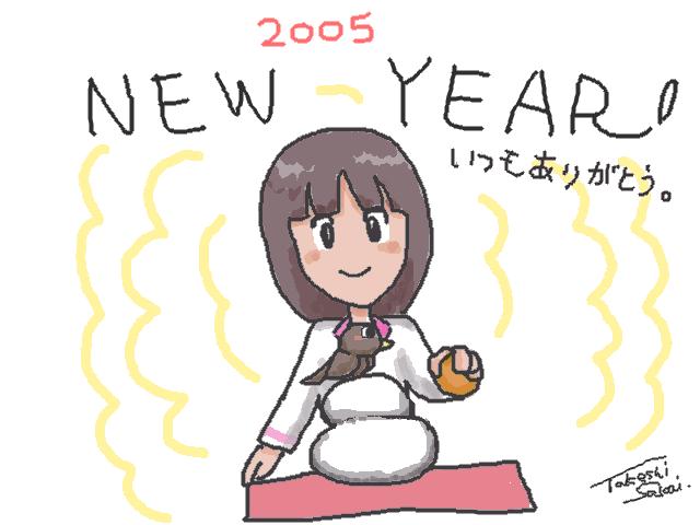 | 2005年正月記念作品「ニューイヤー」 (2005年1月1日) やっぱ鏡もちの上にはみかん…じゃなくて鳥でした。 |