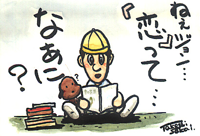 | 22万アクセス記念作品「恋ってなあに?」 (2002年3月6日) 筆ペン&水彩絵の具で書いた手描きのイラスト。う〜んラフタッチ。 |