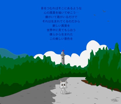 | 24万アクセス記念作品「新しい風景」 (2002年5月1日) さわやかな夏をイメージしたネコちゃん登場のイラスト。木にあたる光と影の具合が鈴木英人のようである。 |