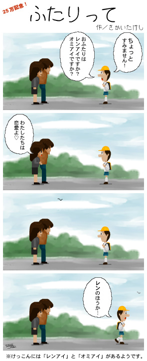 | 25万アクセス記念作品「ふたりって」 (2001年6月5日) 突然4コママンガにチャレンジした意欲作。しかしこのときだけの意欲だったためシリーズ化ならず。最後のコマにサインが入るのはまるでモンキー・パンチのようである。 |