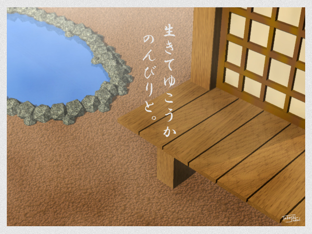 | 30万記念作品「のんびりと。」 (2002年10月13日) 新作『さんぽ日和』のテーマであるのんびりをフューチャーしたCGイラスト。おじいさんの家全体をリアルにモデリングしたが、贅沢にも使用したカットは縁側と池だけ。全体図は同時に公開した壁紙に使われていますのでこちらもどうぞ。毎回10万単位で記念イラストを3DCGにしているが、これがけっこう時間がかかって大変なのだ。次回からは…いや、がんばります。 |